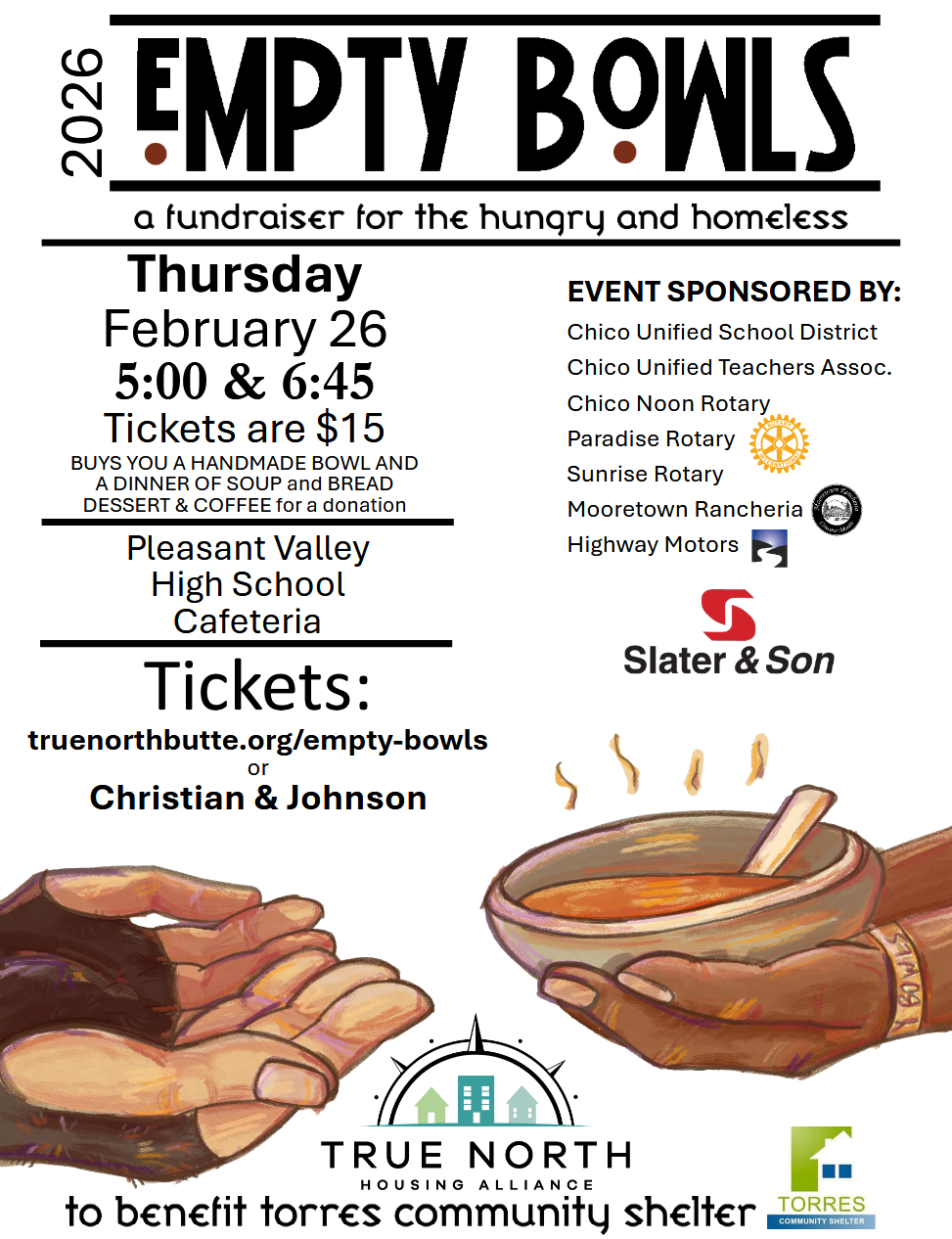 The 23rd Annual Empty Bowls fundraiser for the Torres Shelter takes place Thursday, February 26th, with two dinner times, one at 5pm and another at 6:45pm, at the Pleasant Valley High School Cafeteria, 1475 East Ave. in Chico.